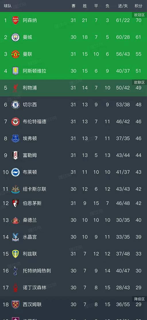 北京时间3月22日,英超第31轮赛事在昨夜至今日凌晨迎来了五场激烈比拼。随着多场关键战役的落幕,积分榜也随之发生显著变化,值得关注的焦点包括利物浦1-2不敌布莱顿,切尔西被埃弗顿3-0血洗,富勒姆主场以3-1逆转伯恩利,利兹联与布伦特福德0-0握手言和,以及曼联在与伯恩茅斯的比赛中2-2战平。